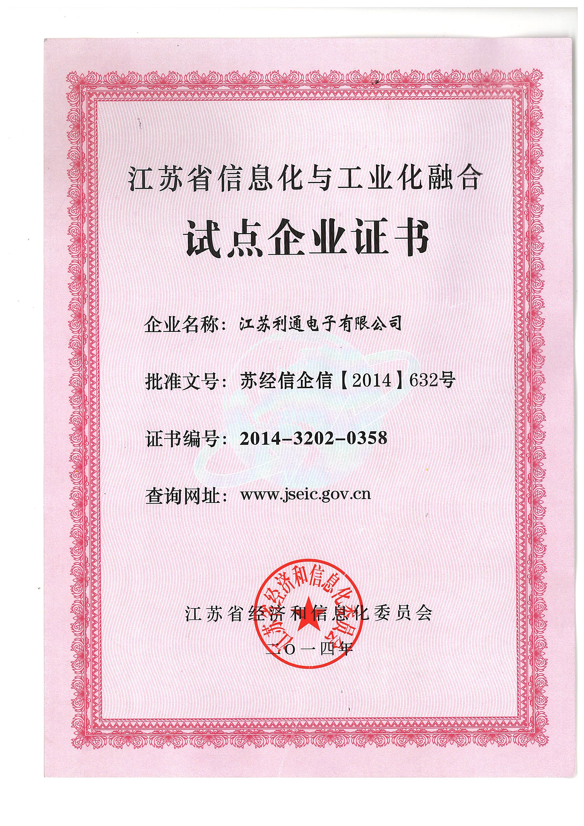 江蘇省信息化與工業(yè)化融合試點企業(yè)證書
